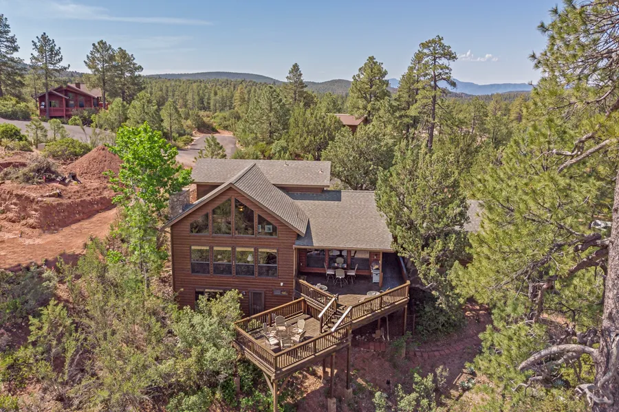 Amazing mountain home located in Solitude Trails gated community in beautiful Pine Arizona. Home features include three bedrooms and three bathrooms. Kitchen offers eat in dining and breakfast bar, pantry, and newer appliances. Family room is open and cozy with vaulted tongue and grooved ceilings, stoned gas fireplace, wall to ceiling windows for those amazing mountain views. This gem comes fully furnished and decorated including kitchen dishes and flatware. The sellers have removed all but a few personal items. What you see is what you get! Bedroom and full bath on main level, loft is master suite with bathroom and finished basement has third bedroom and full bath, family room with pool table. Exterior features include covered entry and deck, two car garage, partially covered back deck with second deck wired for hot tub. Amazing mountain views and private setting.