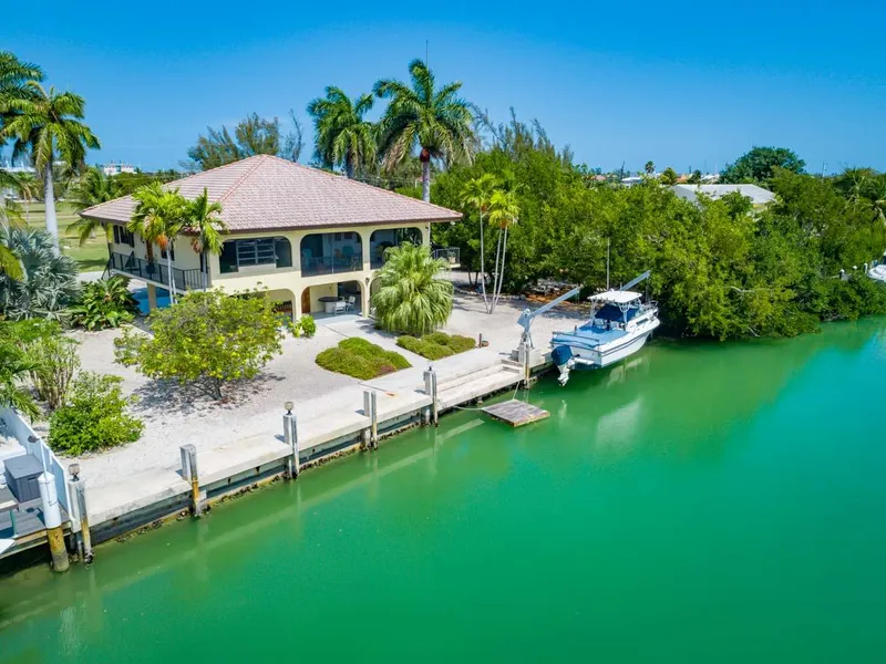 Fantastic Sombrero location with Golf Course views and excellent boating set on a 100' wide crystal clear canal just off Sister Creek which offers quick & easy Ocean and Gulf access. Sprawling over 1.5 lots the 3 Bedroom 3 Bath plus Den concrete home offers 150' of waterfront with 100' concrete dock & seawall plus davits. The open floorpan boasts a large Kitchen with stainless appliances, soaring tongue-in-groove wood ceilings throughout, massive Master Suite and a colossal Porch overlooking the water. Guests will appreciate the separate 1 Bedroom legal Guest Suite downstairs. The 15,475 sq. ft. yard is enhanced with picturesque meandering paths through mature gardens offering lots of privacy.