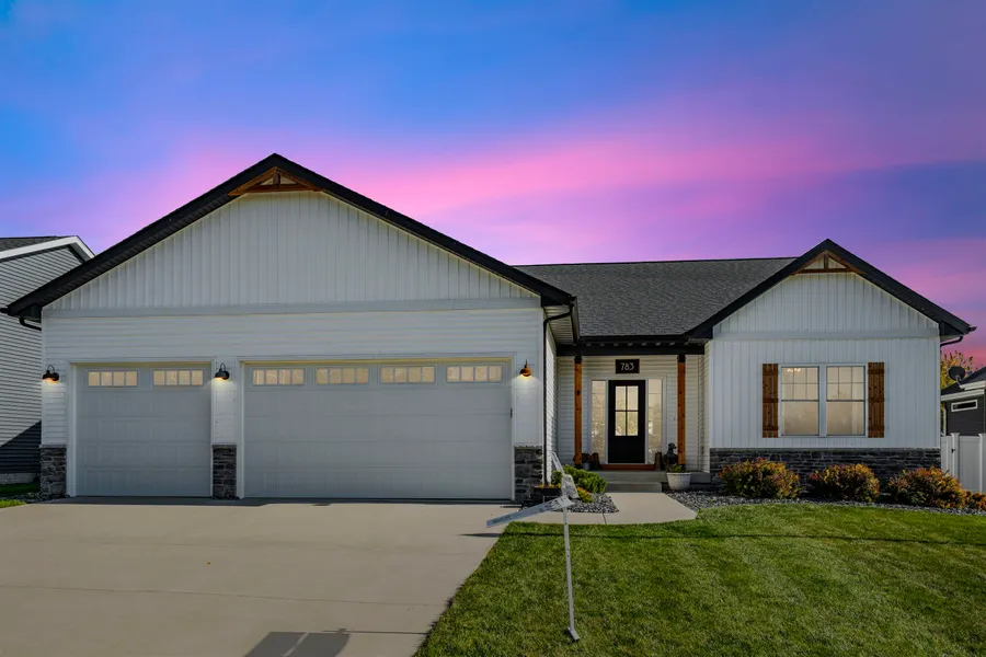 Welcome to 783 Sweet Wood Lane in Blue Grass, Iowa. This single-owner, semi-custom ranch showcases luxury finishes and thoughtful design throughout. The open floor plan features a grand entry foyer and impressive 12-foot vaulted ceilings. Enjoy the open floor plan with an oversized island and eat in kitchen. The primary suite offers a tiled walk-in shower, oversized walk-in closet, and elegant tray ceiling. Two additional bedrooms and a convenient main-level laundry complete the main floor. The finished basement includes a stone fireplace creating a warm a spacious area for entertaining, while the oversized back patio extends your living space outdoors. Relax under the custom cedar pergola with gas firepit, overlooking the fully fenced, oversized backyard.