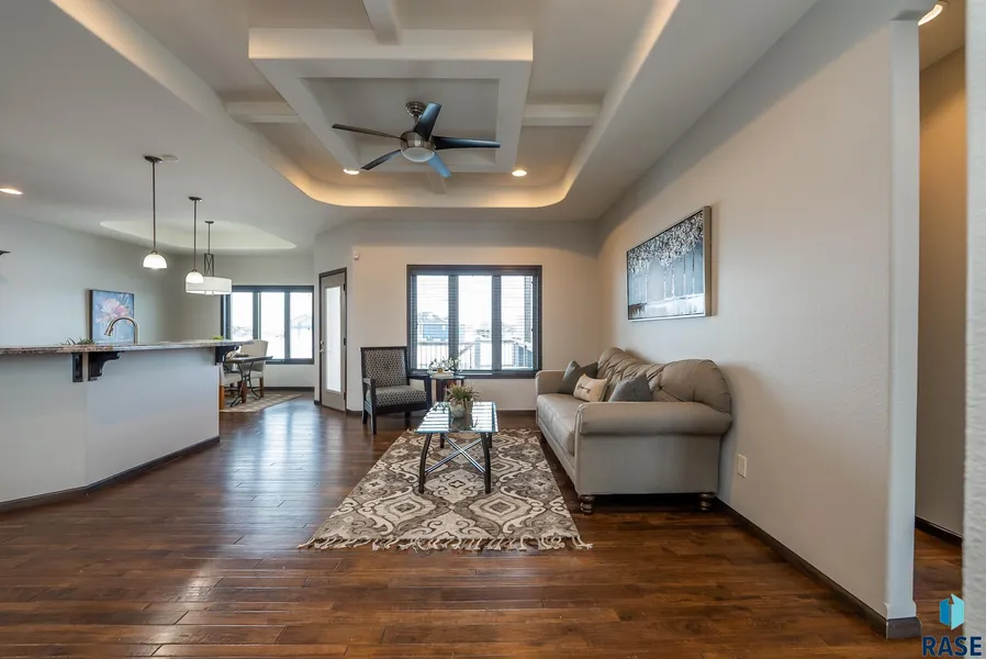 A stunning custom-built home situated on a cul-de-sac in Sioux Falls, SD! Located just a block away from Harrisburg Explorer Elementary, this remarkable property is sure to impress from the moment you pull up, boasting ravishing ceiling details throughout in open concept floor plan and beautiful hickory hardwood floors spanning the main floor living spaces, perfect for those who love to entertain. The kitchen is a chef's dream, complete with raised bar, stainless steel appliances, and a HUGE walk-in pantry. The large dining area offers a door to the covered backyard deck, making it the perfect spot for summer barbecues and gatherings. With 3 ample sized main floor bedrooms, including the master bedroom boasting a private bathroom hosting dual vanities, a large tile shower with glass door, and a spacious walk-in closet, this home has plenty of space for everyone. The expansive basement fe...