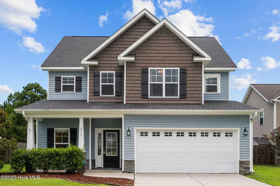 Welcome to 213 Admiral Court, located in the highly sought-after neighborhood of Oyster Landing--just minutes from the Stone Bay gate, MARSOC, and Topsail Beach! This charming coastal blue craftsman-style home with warm mocha accents and a classic Southern front porch invites you in with all the curb appeal and comfort you'd expect from coastal Carolina living. Inside, you'll find a spacious open-concept layout ideal for both entertaining and everyday living. The main floor features a bright living area, large dining space just off the kitchen, a convenient powder room for guests, and a versatile flex room perfect for a home office, playroom, or hobby space. The kitchen shines with rich dark cabinetry, modern gold hardware, updated stainless steel appliances (new in 2024), and a layout that flows beautifully with the rest of the home. Off the garage entry is a functional mudroom and first-floor laundry room, thoughtfully designed for convenience. Upstairs, retreat to the primary suite featuring dual vanities, a glass-enclosed stand-up shower, and a separate soaking tub for relaxing after a long day. Two additional bedrooms and a full bathroom complete the second floor. Step outside to enjoy the back deck and large fenced backyard, bordered by mature trees for added privacy--perfect for pets, play, or peaceful evenings outdoors. The HVAC system was also replaced in 2024, giving you added peace of mind and efficiency. Don't miss your chance to call this beautiful Sneads Ferry home yours--schedule your private showing today!