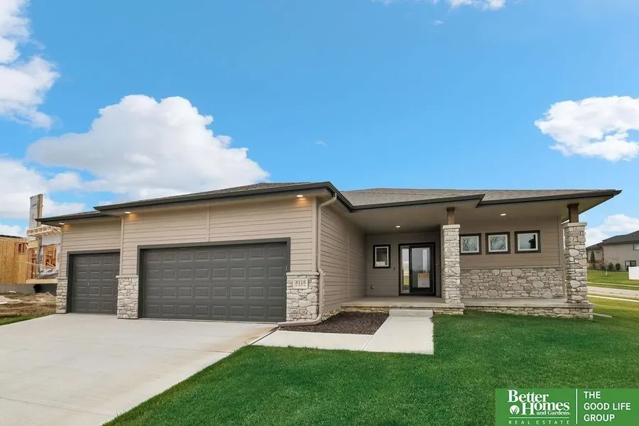 Fall in LOVE! Close in 30 days! Pine Crest ranch in desirable Summer Hill Farm community in Bennington! This spacious 5 bed, 3 bath home features a split-bedroom floor plan, offering privacy and flexibility. With 2 bedrooms on the main floor and 2 more down, there's plenty of room for everyone. The main floor has a large kitchen with a quartz island, ample counter space, including a cooktop and oven, perfect for entertaining & family gatherings. Adjacent to the kitchen, is the cozy living room with fireplace, creating a warm and inviting atmosphere. The primary suite features a tiled walk-in shower, double vanity, and walk-in closet with convenient access to the laundry room. A main-floor office offers a dedicated workspace, while the fully finished basement adds even more living space. The 3-car garage, large corner lot completes this home, providing plenty of room for vehicles and outdoor activities. Don't miss this opportunity to own a beautiful new home/great location!