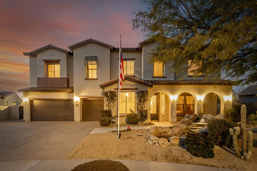 Discover your ideal home with this stunning 5-bedroom, 4.5-bathroom residence that embodies luxury living. The property features a 3-car garage, RV gate, and an inviting front porch, complemented by a meticulously maintained front yard showcasing a captivating water feature. Step into the grand living/dining room with soaring ceilings, where natural light pours in through expansive windows adorned with blinds, highlighting the neutral palette and a mix of plush carpet and wood-look flooring. The great room is a focal point, boasting recessed lighting, a fireplace clad in stone with an insert, and French doors leading to the backyard.
