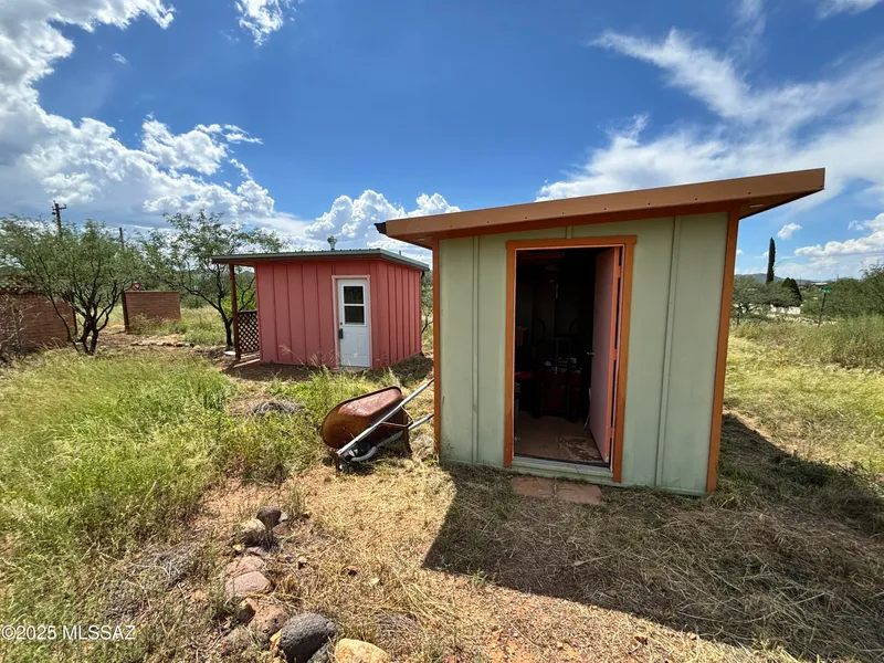 Great corner lot in Arivaca! Installed gray water system. Bathroom with composting toilet. Outbuildings sold as-is. Connected to city water. Fruit trees scattered throughout property.