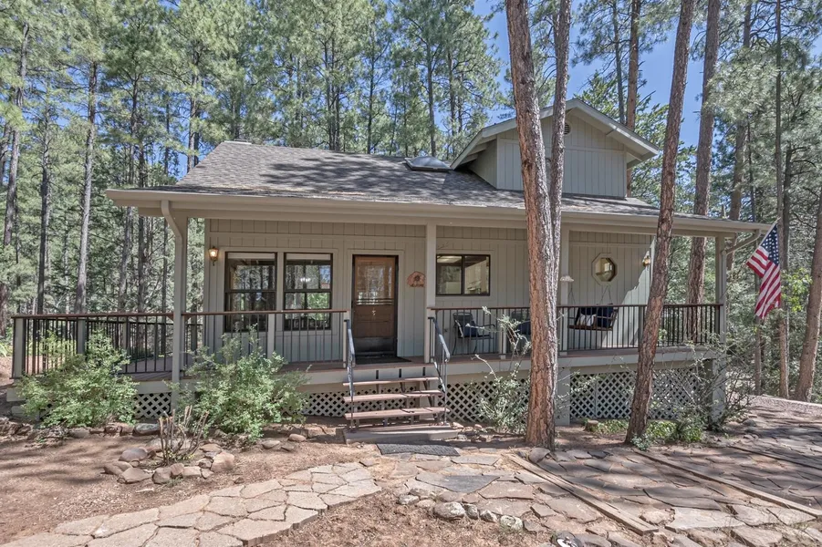 Great getaway, house is on 2 lots in Portal 2--borders common area. Taxes and HOA fees listed are for both lots (combined). Beautiful, private setting among the tall pines. One bedroom and bath on main level, one bedroom and bath on second level with loft. You will enjoy the views from the large windows in the great room as well as from the outside deck. New split unit A/C and Heat.