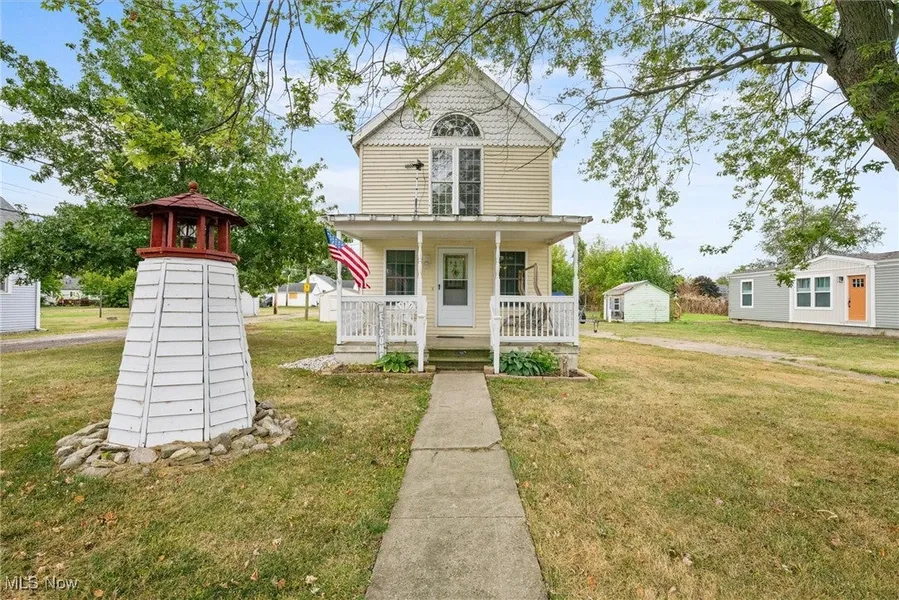 Charming Victorian style home with modern touches! This custom-built beauty features classic vinyl siding, an eye-catching fish scale gable and decorative lighthouse that illuminates your front yard. Inviting front porch to relax, read or simply enjoy nature. The first floor offers a spacious kitchen, dining area, living room and convenient half bath. The second floor includes primary bedroom, second bedroom, and full bath. Durable laminate wood flooring throughout. Recent updates include a new wood deck, ideal for entertaining, as well as newer furnace and heat pump (2022). This property includes two parcels plus two storage sheds.