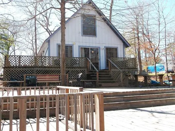 3 bedrooms. 1 bath, affordable, waterfront A Frame wood home, with extra lot right on Hickory Hill. Inside has attractive wood floors and ceilings, big windows, and roomy living area. Outside are multi-level decks to the water, has enclosed boat house on rails and floating dock. Beautiful deep water in protected cove. Perfect camp in great neighborhood and on main street with easy access to 255. Looking is free, so call agent today.