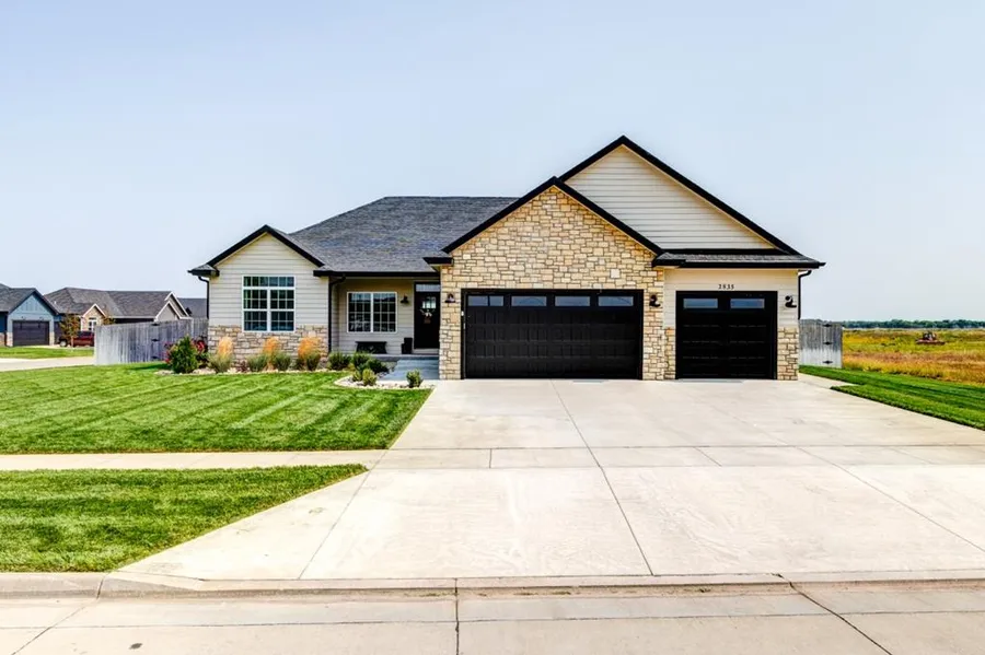 This beautiful 3 bedroom, 2 bathroom, 3 car garage home features great presentation and wonderful views. Open concept living area w/ a gorgeous built-in fireplace. Natural light throughout. Gorgeous kitchen is finished w/ granite countertops, walk-in pantry, farmhouse sink and is flattering w/ a harmonizing color palate. Dining is just off of the covered patio - perfect for entertaining. Primary suite is complete w/ a large walk-in closet, luxurious tile walk-in shower, and double vanity sinks. Split floor plan w/ two nice sized bedrooms & hall bathroom complete w/ tiled shower and onyx countertops. Full basement is unfinished, and could have two more bedrooms and a bathroom. - so much opportunity. Huge privacy fenced backyard w/ sprinklers & landscaping surround home.