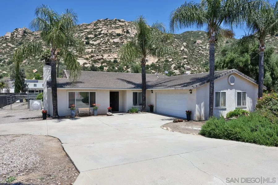 Enjoy resort style living in San Diego Country Estate in this 3 bedroom, 2 bath home with 1,712 sf. Vaulted ceilings and open great room concept floor plan add to the spacious feeling. Primary suite has walk-in closet, private en-suite with oval tub with shower and dual basin sinks. Kitchen with granite counters and plenty of cabinet space. Fireplace is in the living room with picture window to take in the sunlight and views. Property is fenced and cross fenced with barn and hose facilities as well as 2 double gate access from front and rear of property. 21 solar panels are owned. 2 car attached garage and plenty of room to park horse trailers, RV or other toys.