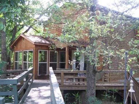 #1934-RIVERFRONT CABIN-OZARK MTS. SOUTH FORK RIVER CABIN-3 BEDROOMS 2 BATHS ON WHITE WATER SHOALS ON SPRINGFED SOUTHFORK RIVER NEAR 'HIGH FALLS' WHERE SOUTH FORK RIVER & SPRING RIVER MERGE.THIS UNIQUE RIVER CABIN FEATURES A SOARING VAULTED CEILING WITH NATIVE STONE FIREPLACE, HARDWOOD FLOORING, CUSTOME WOOD CABINETS & FLOOR TO CEILING WINDOWS. TUCKED AWAY AMONG COTTON WOOD & SYCAMORE TREES ON THE RIVER, THIS CABIN WAS COMPLETELY REMODELED RECENTLY WITH AN OPEN CONCEPT GOURMENT KITCHEN, DINING ROOM & LIVING ROOM. THE MASTER BEDROOM & MASTER BATH IS ON THIS MAIN LEVEL. THERE IS A SUN ROOM/VERANDA OVERLOOKING THE RIVER & MULTI-TIERED DECKS, SAND BEACH & STONE TERRACE BELOW. UPSTAIRS, THERE ARE 2 BEDROOMS, FULL BATH & STUDIO. THE LIVING ROOM OPENS ONTO AN UPPER DECK WITH ANOTHER BOARDWALK LEADING TO AN EXTENDED DECK AT THE RIVER EDGE. THE LOWER GROUND LEVEL HAS A FULL BASHEMENT & SIDE...