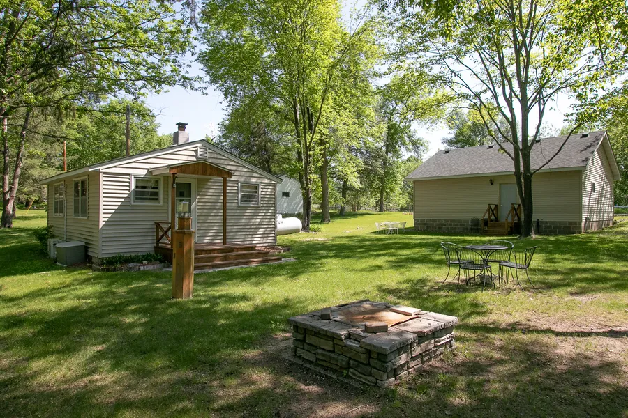 This quaint lakefront property emits relaxation and peacefulness! With 75 ft of lakeshore on stunning Blue Lake, there's so much to enjoy here! Stepping into the oversized detached garage, tongue and groove accents in a nice sitting area surround you, complete with modern tile floor and walk in shower to use after relaxing in your own SAUNA! You can have the retractable screen garage door pulled down and there are two Murphy beds for additional sleeping areas for friends & family. Don't forget about the 2 RV electrical hookups on the exterior of garage/home. Heading into the cabin, you'll notice the wood accents continue to give that rustic and cozy feeling. Two bedrooms and a 3/4 bath, large windows look out to the water at the eat in kitchen area. Cabin comes mostly furnished including dock, boat lift, pull out couch, queen bed, log bunk beds, dining set and pool table in garage. Walk ...