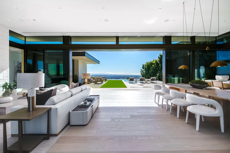 Indulge all of your senses in this brand-new Contemporary marvel located in the prestigious Bird Streets. Showcasing supreme quality with the finest materials, this estate embodies luxurious Los Angeles living and is the ultimate view estate with unobstructed jetliner vistas from Century City to the Pacific Ocean. A masterful creation by Paul McClean architecture, built by Dugally Oberfeld, and interior design and finishes by Marmol Radziner, this home features every conceivable amenity. Spanning approx. 13,400 sq. ft. of living space with 7 bedrooms and 9 bathrooms, there is ample space for friends, family, staff, and entertaining. Offering privacy and security, a gated driveway leads to a subterranean 8-car garage and the gated front entryway leads to the glass front door across a bridge spanning above the lower level interior courtyard oasis. Equipped with state-of-the-art smart home technology and custom automated walls of glass that amplify the incredible views throughout. The main level offers a grand living room with fireplace, dining area, expansive kitchen with enormous island and Wolf and Subzero appliances, family room, powder room, two guest bedroom suites with one furnished as an office, and the beautiful primary bedroom suite with walls of glass and terrace overlooking the views, fireplace, dual walk-in custom closets, and Afyon White Slab marble bathroom. The living room and primary bedroom flow into the exterior space featuring lounging terraces, fireplace, synthetic turf, and zero-edged pool and spa. Descend the floating staircase or take the elevator to the lower level which offers an incredible entertainer's oasis and wellness retreat. Features include a living room with large built-in bar, game/billiard room, glass wine display, gorgeous theater/media room, huge gym with walls of glass to covered patio, and spa with massage room, large shower and sauna. There is also a remarkable interior courtyard Zen-garden with water wall and the most beautiful living wall that brings light and nature inside. The lower level is complete with a guest suite, powder room, laundry room, and two staff suites. Discover this ultimate hillside oasis just moments from the excitement of Sunset Blvd and the best of Los Angeles dining, shopping, entertainment, and nightlife.