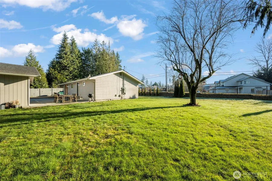 Welcome home to this beautifully updated rambler offering comfort, functionality, and space on your own private slice of heaven. The home underwent extensive updates in 2023, including fresh interior paint in the main living areas, new trim and doors package, custom front door, modern exterior back door, remodeled bathrooms, and LVP flooring in the bedrooms. The kitchen features quartz countertops and a gas stub ready for a future tankless water heater. Two ductless mini-split systems (approximately two years old) provide efficient heating and cooling. Sellers are including all appliances, and the property also features an outdoor sauna for year-round relaxation. Major exterior improvements completed in recent years include the roof, fascia boards, gutters, garage doors, exterior paint, and a cement patio with stairs. During the sellers' ownership, the electrical panel was also replaced and updated. The versatile garage and detached shop offer exceptional flexibility, with space that can function as a home gym, workshop, traditional garage, and an adjacent office or additional storage area, plus an oversized bay accommodating two vehicles and a new epoxy floor. Situated on a large lot with the ability to connect to sewer, and conveniently located just minutes to shopping, Mill Creek Town Center, and more.