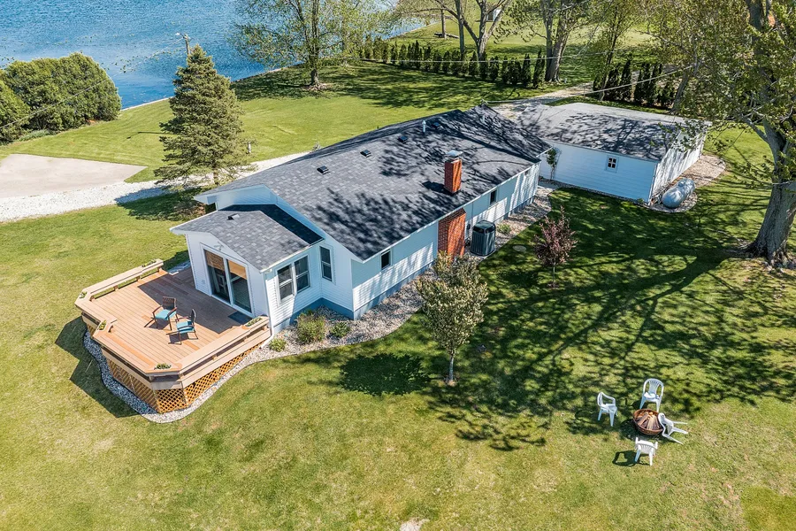 Located on the 554-acre all-sport Dewart Lake in Syracuse, IN, known for its fantastic fishing, sandy beach bottom, and great skiing is this fabulous updated lake cottage waiting to be snapped up by its lucky new owners. Dewart Lake is situated within a short drive of the great small towns of Syracuse, North Webster, Warsaw, and Winona Lake. They each offer terrific restaurants and activities that expand your lake living experience. This easy-maintenance lake home on 100 feet of lake frontage makes it a pretty special lake escape or full time home. With a rare large yard and sandy beach bottom for swimming, it provides much outdoor living space for family and friends in addition to lake itself. The home was taken down to the studs and fully remodeled in 2016, upgrades such as hickory hardwood floors, updated bathroom, new windows, upgraded electrical, HVAC, and appliances. In 2020 a new roof and new siding were installed. This 1,152 sq. ft maximizes space and offers 3 bedrooms, a full bath with dual vanities, both with spacious granite countertops and a beautiful, updated kitchen that is thoughtfully laid out to capture the great lake views. The kitchen has white custom cabinets, all with soft close hinges, granite countertops, and stainless steel appliances. It is open to the dining and living room space including a cozy wood-burning fireplace for cool lake nights and fall/winter weather. The large lakeside deck provides the ideal spot to watch the sunset and provides storage underneath for all your lake and boating toys. The 2-car detached garage offers one bay perfect for storage, and the second bay was upgraded with epoxy floors, a 1/2 bath, and the ideal space to even host large meals or lakeside gatherings as the current owners do!