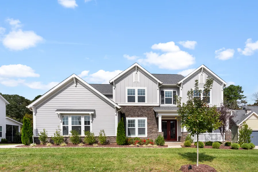 Luxurious 5-Bedroom 4.5 bath Home with $25,000 Buyer Incentive for Rate Buy-Down or closing costs featuring a Guest suite w full bathroom on main level, Master suite on 2nd level, a gourmet kitchen w large bay windows, a panoramic wooded view, two islands, quartz countertops, ceiling high cabinets, walk in pantry and a planning center. Motorized shades in kitchen, family room and master suite. Epoxy flooring in 3 car garage with EV charging in additional 4th bay. Upstairs laundry rm w upgraded cabinets. 2nd Laundry rm on main can be used as a catering kitchen or utility room. Enjoy wrap around screened porch, w fireplace and ceiling fans. Large Paver patio and beautiful landscaping in the fenced in backyard that backs up to a protected wooded area for privacy. Built in ceiling speakers in the kitchen, family room and outdoor porch. Bonus room includes surround sound. This home features a...