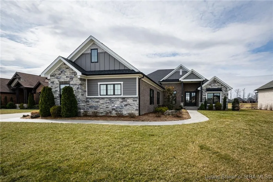 Located in the Prestigious Estate Section of Champions Pointe, this Discovery Builder Landry II plan offers Breathtaking Views of the Golf Course and Lake on hole #9. Over 3,200 sq. ft., this 4-bed, 3-bath split ranch home is a dream! As you enter through the Dbl 8' fr doors, you'll be welcomed into the Foyer and Gr Rm ft a Tray Ceiling, CSTM BUILT Bookcases, and Triple Windows offering PICTURESQUE Golf Course views. The Kitchen includes Cstm Cabs, Granite Tops, a Lrg Island, and SS Appl. The Private Primary Suite offers STUNNING views and incl a SPA-LIKE ensuite with a large shower for two, an oversized dbl vanity, linen closet, and a massive WIC. The 2 addtnl GENEROUSELY sized Bedrooms share a bath and feature double closets. The lower level is designed for entertainment with a TV/Fam Room, WET BAR ample space for a pool table, and a 4th bed with 3rd full bath. Convenience is key with an 3-car side-entry garage, a Drop Zone, an E-SPACE/POCKET OFFICE for work, and Laundry Rm with cabs, a folding table and sink. The exterior features a Covered Front Porch, PROFESSIONAL Landscaping, an Expanded back Covered Patio, and an incredible Golf Course View. Upgraded features include CUSTOM Blinds and Drapery, an Irrigation System, and Stamped and Stained concrete for the porch, sidewalk, and back patio. Enjoy the Pool and Splash Pad /Pavilion, Tennis/Pickleball/B-ball Courts. Access to Championship Golf Course, Clubhouse, Pro-Shop, Driving Range, Pub & Grill. Sq ft & rm sz approx.
