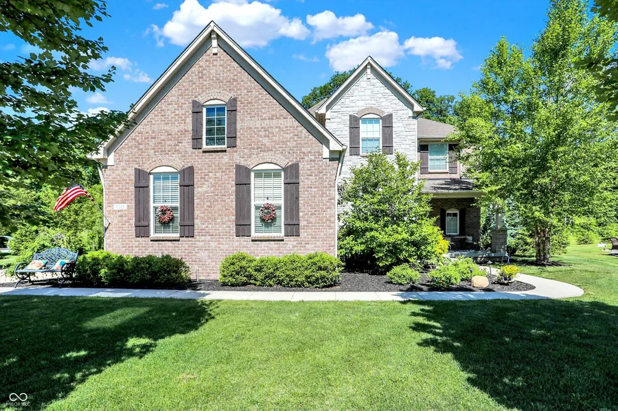 This wonderful home blends luxury and functionality, offering exceptional craftsmanship and thoughtful design throughout. The main level showcases beautiful architectural details, including a coffered ceiling in the living room, panel molding in the entry, and crown molding in the kitchen and dining area. The gourmet kitchen is a chef's dream, featuring a spacious island, gas cooktop, double ovens, and touch faucet. Custom cabinet organizers enhance storage efficiency, while the walk-in pantry provides additional convenience. The first-floor primary suite is a private retreat. Master bath offers double vanities, a soaker tub, dual-head tiled shower and custom walk-in closet. Work from home in style with a main level office, complete with custom two-sided desk, printer cabinet, French etched glass doors, and ample filing storage. Upstairs you'll find three generous sized bedrooms, including a Jack-and-Jill suite, two full baths, and a spacious living area featuring a mini bar and game closet. Outdoor living is equally impressive! Relax on the large covered porch with gas fireplace, or enjoy entertaining on the spacious paver patio featuring wall lighting and party lights. A built-in natural gas line makes grilling easy. The beautifully landscaped .44-acre lot offers privacy and mature trees. Oversized three-car garage includes built-in storage, a sink, and furnace. Neighborhood pool offers the perfect place to soak up some summer sunshine. Wonderful Zionsville schools ... with Union Elementary just a bike ride away. Situated on a peaceful cul-de-sac, this home offers refined living with modern conveniences-truly a must-see!
