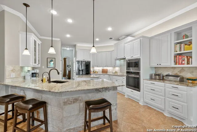 Set among mature trees in the prestigious Fair Oaks Ranch community, this 4-bedroom, 3.5-bathroom home blends timeless elegance with thoughtful design. Beautiful curb appeal and luxurious accents set the stage for the open, inviting interior. The living room makes a statement with rich wood beams, a stone accent wall, and built-in shelving, creating a warm yet sophisticated atmosphere. A spacious chef's kitchen offers stainless steel appliances, inlay oven and microwave, an inlay electric cooktop, ample cabinetry, and a peninsula with bar seating. The layout flows seamlessly into the formal dining room and a front office, providing both entertaining space and quiet work areas. The grand primary suite features an en suite bathroom with dual vanities, a separate soaking tub and shower, and an expansive walk-in closet. Additionally an dedicated media room offers the perfect space for movie ...