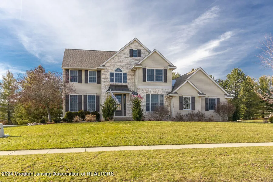 Dewitt. Sought after Heritage Glen Subdivision's newest offering with this Motz built 2632 square foot, 4 bed, 2.5 bath warm and inviting family home! Nestled on a quiet street with a fabulous backyard. Enjoy the two-story foyer, main floor study with french doors, built in desk and shelving plus pretty crown molding. Real hardwood flooring through most of the main floor gives the home an alluring look. Dramatic special oversized family room including a stone fireplace, cathedral ceilings, large enough for the whole family with deck access with maintenance free tracks boards! Spacious kitchen including a center island with bar stools, quartz countertops, stainless steel appliances with a 5-burner gas stove and three door refrigerator, planning center and informal eating space! 1st floor laundry is generous in size with storage and sorting space. New half bath with special tiled flooring and wonderful new vanity. Oversized back hall walk in closet is the perfect drop zone space and could easily work as extra pantry space. 3 car end loading garage too. Formal dining and living with pretty crown molding. 4 bedrooms on the second floor including a spacious primary suite with a walk-in closet, double sinks, whirlpool tub plus a separate stool and shower room. The full basement is ready to be finished including two egress windows and plumbed for a full bath. Attached three car garage. Newer roof shingle in 2019. Seller reserves security system and TV's. Note the upgrade list.