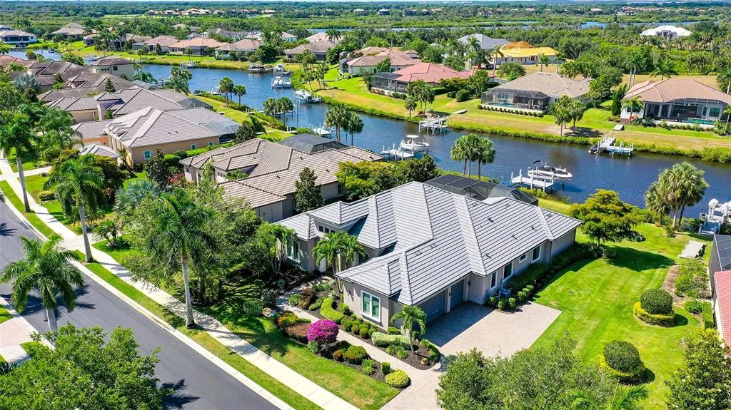Under contract-accepting backup offers. Welcome to your waterfront luxury oasis - a custom-built, 3,627 sq. ft. Arthur Rutenberg Coquina design home by Bob Williams. This stunning residence effortlessly combines elegance and functionality, showcasing breathtaking water views, nine distinctive architectural ceilings, abundant storage, and numerous high-end upgrades throughout. Nestled in the award-winning community of The Islands on the Manatee River, voted 'Best Community' in the Sarasota-Bradenton Parade of Homes for 8 consecutive years, this canal-front property offers direct boating access to the Gulf of Mexico and easy golf cart access to the community's golf course and club house, The Club at River Wilderness. Upon entry, you will be greeted by a spacious foyer featuring a 13-foot tiered ceiling that beautifully frames a stunning bar and seamlessly connects the oversized dining room to the expansive great room and gourmet kitchen. Each room is accentuated with exquisite architectural details and expansive ceilings. This open floor-plan design is perfect for both flawless entertaining and functional day-to-day living. The kitchen is a chef's delight, equipped with top-of-the-line Jenn-Air appliances and sleek, modern cabinetry, complemented by a hidden pantry tailored for culinary artistry and casual entertaining alike. The breathtaking water views from these central living spaces create a serene and inviting atmosphere. For a more intimate experience, retreat to the oversized den also overlooking the waterway, which can also serve as a fourth bedroom. The split floor plan ensures privacy, with the expansive owner's suite offering stunning water views, dual walk-in closets, and an oversized luxurious bath. Family members and/or guests will feel pampered in either of the two well-appointed guest bedrooms. Step outside to the expansive lanai, lined with elegant Alaskan Silver travertine pavers. This outdoor haven is equipped with a custom-designed heated saltwater pool and spa by a premier pool builder, an outdoor kitchen featuring a Memphis pellet grill, a fire pit, and panoramic no-see-um screens for unobstructed views. The Islands has convenient access to many surrounding areas. The Fort Hamer bridge seamlessly connects residents to Lakewood Ranch. Enjoy the sophistication of Lakewood Ranch's retail and dining amenities, all just a short drive from your gated sanctuary. Locally in Parrish, discover the allure of new shopping and dining experiences just minutes away. The town is positioned for growth, with ongoing commercial development promising even more opportunities for entertainment, retail therapy, and culinary exploration in the near future. Don't miss this rare opportunity to own a piece of paradise, where luxury living meets waterfront bliss. Schedule your private tour today!