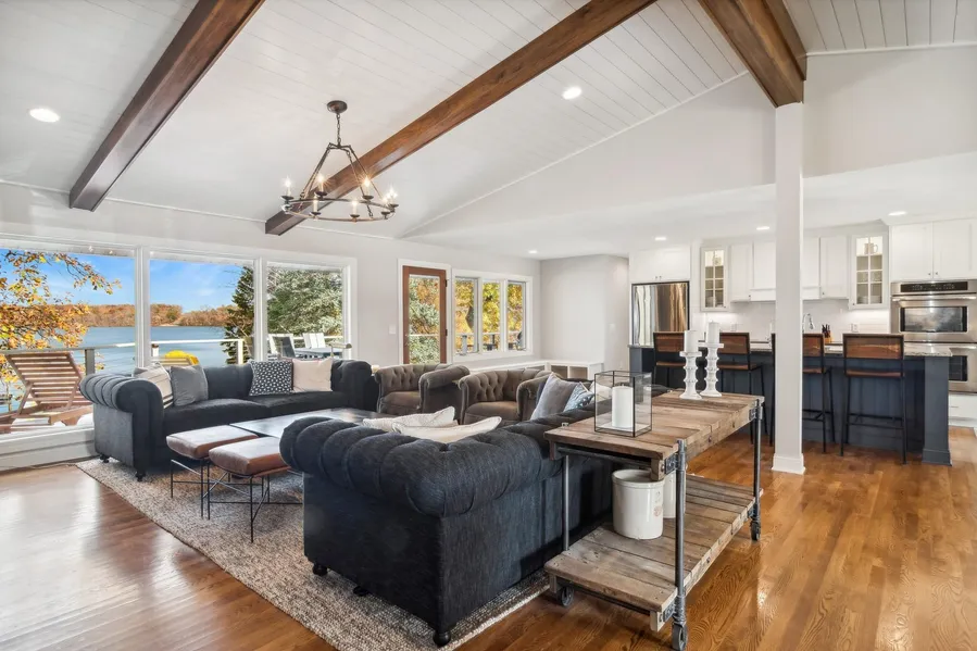 Welcome to luxury lake living at its finest! This stunning 5-bedroom, 4-bathroom lakeside rambler is situated on the best lot on the lake. boasting a pristine sandy lakeshore for endless summer enjoyment. Completely remodeled with every detail in mind, this home offers an unparalleled blend of style and comfort. The heart of the home is a breathtaking stone fireplace in the main living room, complemented by vaulted ceilings with rich wood beams and an open floor plan that effortlessly connects the spaces. The chef's kitchen is a true entertainer's dream, featuring an oversized island perfect for gatherings and gourmet meals. The primary suite is a tranquil retreat with expansive picture windows offering captivating views of the lake, a spa-like bathroom, and a custom walk-in closet. The main level also offers two additional bedrooms and two more bathrooms, ideal for family or guests. Ste...