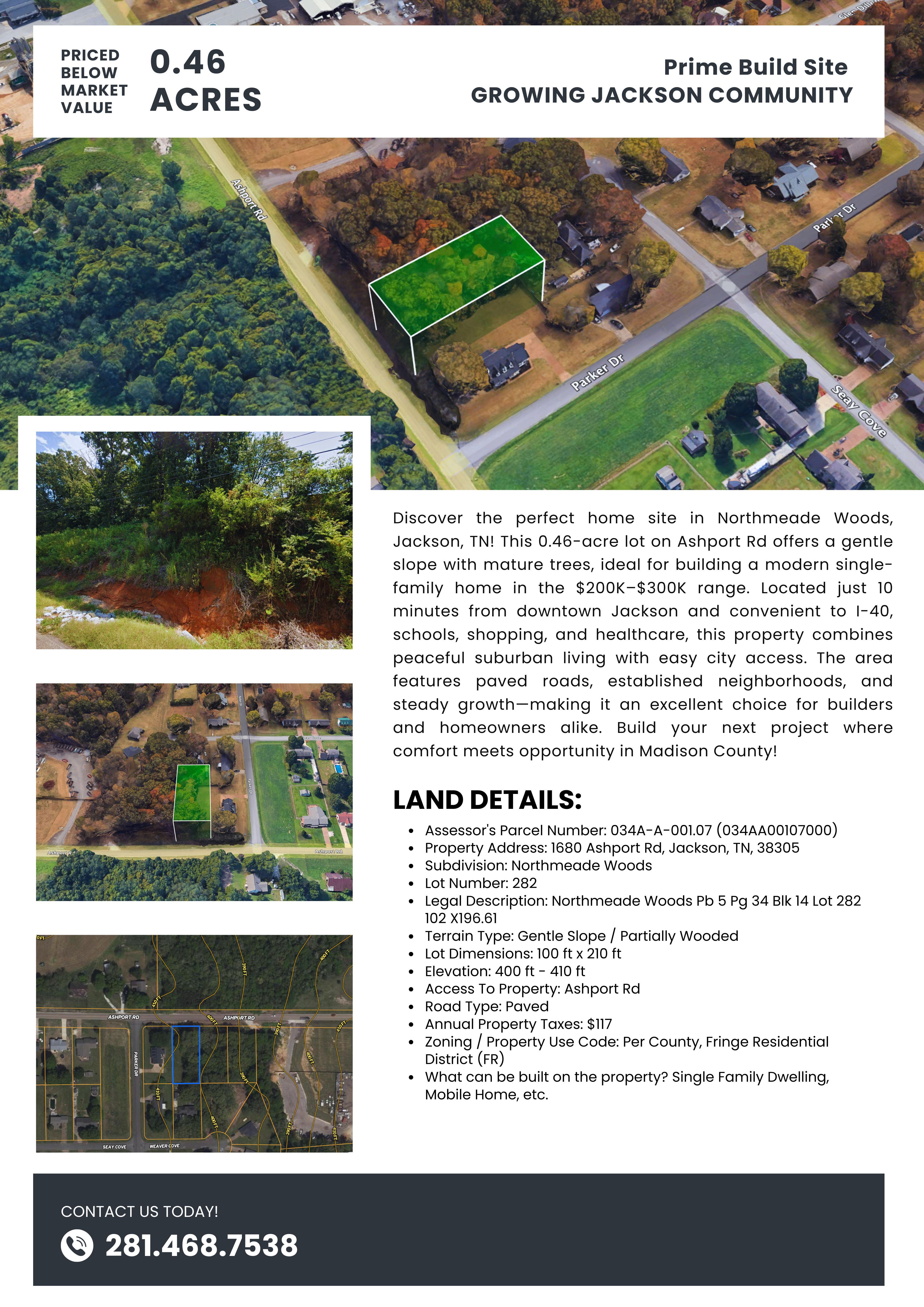 Discover your next opportunity in the peaceful Northmeade Woods subdivision of Jackson, Tennessee. This 0.46-acre lot sits along Ashport Road, surrounded by established homes, tall trees, and a welcoming suburban atmosphere. With a gentle slope and partially wooded terrain, this property offers the ideal blend of privacy and buildable space for your dream home.
