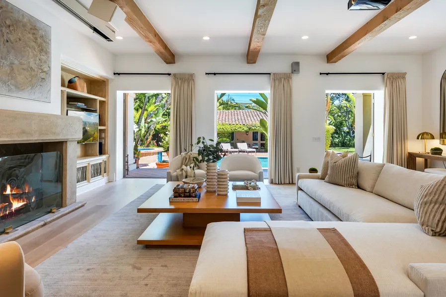 Presenting The Bedford Estate, a newly refreshed Mediterranean masterpiece in the coveted Flats of Beverly Hills. Gated and private, the striking white exterior with black trim is framed by a circular driveway, leading to an elegantly designed two-story residence of approximately 11,000 square feet on a half-acre of pristine grounds. A dramatic two-story foyer with a sweeping staircase introduces the formal living room, dining room, office, and an exceptional family room with floor-to-ceiling French doors that open seamlessly to the backyard. Wide-plank white oak floors, soaring ceilings, expansive windows, multiple fireplaces, and abundant natural light create a warm yet grand atmosphere. The chef's kitchen is a culinary dream, featuring skylights, a large center island, and an expansive informal dining area that also opens to the outdoors. The backyard is a private oasis, offering multiple seating and lounging areas, an inviting pool, and a beautifully landscaped grassy yard. A separate pool house complete with a bath provides the perfect retreat or entertainment space. Upstairs, the primary suite is truly exceptional, showcasing vaulted beamed ceilings, floor-to-ceiling windows, a fireplace, and two luxurious spa-style bathrooms each with a seating area and boutique-sized closets. Three additional upstairs ensuite bedrooms offer generous proportions, high ceilings, and refined finishes. A service bedroom is conveniently located downstairs near the back staircase. Completing the estate are two attached garages plus two additional garages accessed from the alley. This is truly a one-of-a-kind home in a one-of-a-kind Beverly Hills location.