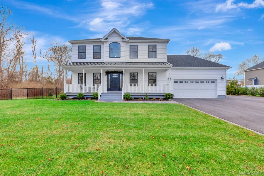 Tucked away at the end of a cul-de-sac block on a newly developed street, this exceptional residence built in 2023 offers modern comfort, luxury finishes, and a dream outdoor oasis. Enjoy the privacy of only having one neighbor next to you. The heated, saltwater inground pool, installed in 2024 by Swim King, is the highlight of the property, surrounded by a gorgeous paving stone patio that is perfect for arranging many different sitting and dining areas. Paver walkways lead you to the beautifully landscaped yard, creating a serene and elegant outdoor setting. The home’s exterior features upgraded black-frame windows and a stylish metal front porch roof, enhancing its modern curb appeal. There is plenty of room for your guest to park with the extended driveway that wraps to the side of the home. Step inside to a bright and airy interior designed with additional windows to fill each room with natural light. A dramatic two-story entry foyer welcomes you, leading to spacious living areas all with hardwood floors throughout. The kitchen is equipped with a center island with built-in microwave, free standing hood and adjoining Butler’s Pantry complete with a beverage/wine refrigerator that is perfect for entertaining. Upstairs, you’ll find upgraded bathroom tilework and showers, along with the convenience of a second-level laundry room. A full basement with outside entrance (OSE) offers endless potential for future customization. Located in the highly regarded East Moriches School District, offering a choice of ESM, Center Moriches, or Westhampton Beach High School. East Moriches is known as the gateway to the Hamptons, providing easy access to all the beauty and amenities the South Fork has to offer. This young, meticulously finished home is truly turn-key and ready to enjoy both inside and out.