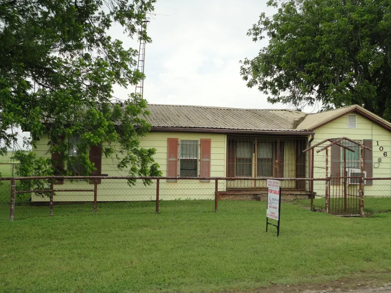 Charming three (3) or four (4) bedroom, two (2) bath home on the corner of three (3) city lots; Metal exterior siding and roof; Chain-link and pipe fenced yard; Two (2) car 22' x 20' detached metal garage with an additional 20' x 10' storage area in the rear of the garage; Carpet in the living room, step-down den, home office and bedrooms; Vinyl flooring in the kitchen, dining area, utility room and both bathrooms; Spacious kitchen with an almost new free-standing smooth top cook stove, vent-a-hood, built-in dishwasher, double sink, ample counter work space and cabinets; The dining room offers a lighted ceiling fan, built-in bar with cabinets, counter space and a pass-through window into the den; The hall bathroom has a tub/shower combination, commode, sink/vanity and linen closet; The master bedroom has an ensuite with a tub, commode and sink/vanity; A home office adjoins the den which could be used as a fourth (4th) bedroom; Wall heaters and hot water heater (propane); Refrigerated window units; Covered 25' x 15' back patio; 20 x 10' metal shop/storage building; Mature pecan and pine trees; In-ground concrete cellar; Water well (currently not in use and condition unknown); Septic system; City water for household use.