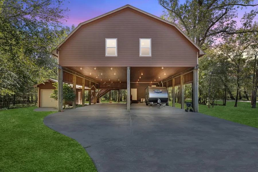 RARE FIND! Sprawling Craftsman Style Home in canopy of trees, set on tranquil ~ ½ Acre Lot. Versatile Open Plan, Metal Gable Roof, Cathedral Ceiling & Highland Hickory floors. Kitchen: Maple Cabinets, Massive Island w/ Solid Granite Slab, SS Appl, Walk-In Pantry, Pendant/Recessed/Undercab lighting & Breakfast Bar open to Family Rm, Dining & Game Rm. Spacious Bedrooms fit Queen Furnishings, Ample Storage & Custom Built-In DayBeds. Lux Bath w/ Clawfoot Tub, Marble Top & Tile Floors. Plantation Shutters, Dbl Pane Windows, PreWired Surr Snd. Bathroom Two, Laundry Rm, Workshop/Storage & Golf Cart Garage on first flr. 210sqft Deck overlooking property. 2,162sqft Cov'd Pavilion w/ 14’ Clearance, 50 & 30amp, abundant lighting, outdoor ceiling fans - fit RVs w/ full service or for Entertaining. 10in pilings 14’ below & above ground, concrete reinforced w/ rebar supports additional loads. Amenitie...