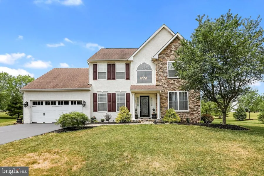 Lovely stone and stucco colonial located on 1/2-acre of premium level lot in sought-after Mayfield Estates. The 1st floor features an elegant 2 story ledge stone accented foyer with hardwood floors, crown molding, French doors complete with a metal staircase leading to the 2nd floor. This main level also showcases an office, 1/2 bath, a formal living room, an oversized dining room for entertaining, a family room featuring a gas fireplace with marble surround, and a large Gourmet Kitchen with 42' Cabinets, granite countertops & island, recessed lighting and pantry. A fabulous sunroom finishes off the main level with French doors leading to a custom patio complete with built-in gas and charcoal barbecue grills and a mini-basketball court for hours of enjoyment.The 2nd floor highlights an inviting Master Bedroom Suite with an incredible walk-in closet and an en-suite (master bathroom) with custom tile, double sink vanity, soaking tub, and shower. Three other bedrooms and a full bath w/tub round out the 2nd level for plenty of comfort and convenience. This wonderful home also has an additional 900+ sq.ft. of finished space in the lower level that is perfect for entertaining. The development features a community green for outdoor fun and games and located minutes from the Perkiomen Trail.This property is situated in the highly-rated Perkiomen Valley School District. Owner is a licensed real estate agent.