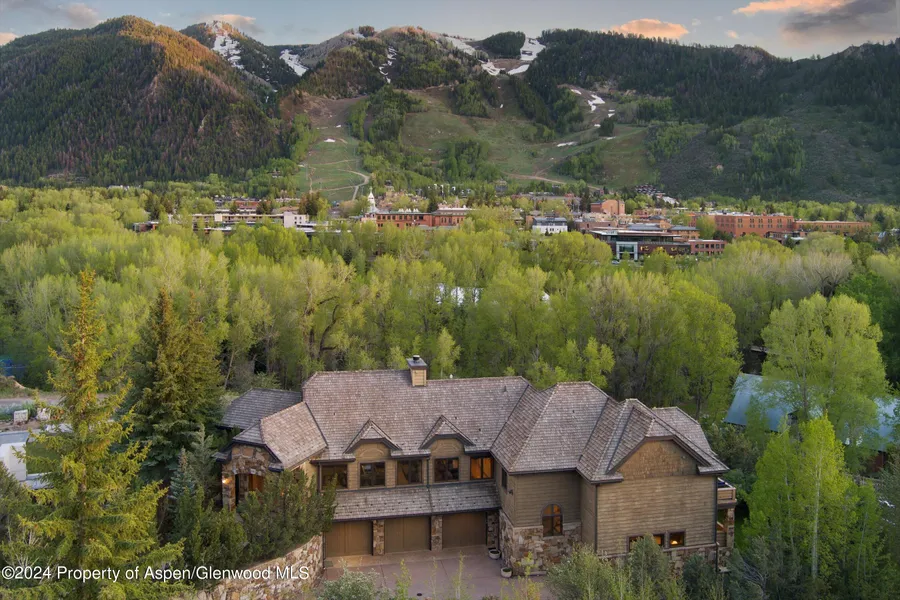This nearly 6,000sf 5 bedroom, 8 bath mountain home boasts all day sun exposure and panoramic views from Independence Pass to Mt Sopris. Located on a residential cul-de-sac walking distance to town, this home offers a wonderful combination of privacy and convenience. The layout, spread over three levels connected by an elevator, includes an upper level living area and lower level family room perfect for accommodating large groups. Gourmet kitchen, dining room connected to a generous living room by a gas fireplace, a breakfast bar, spacious balcony and hot tub compliments the mountain scenery. The primary bedroom lives on its own level with his and her closets, a spacious bathroom, private deck, and office. Air conditioning on the upper and middle levels and multiple fireplaces for warmth in the winter offers year round comfort. The breathtaking views, access to the Roaring Fork River for Gold Medal fly fishing, and privacy exude serenity less than a mile to town.