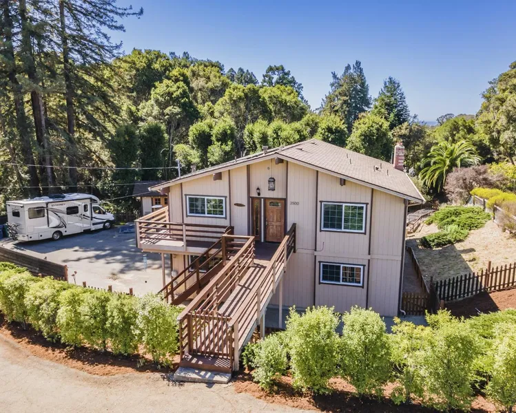 Located in the highly desirable Vienna Woods neighborhood of Aptos offering a perfect blend of convenience and coastal lifestyle. With easy access to the trails of Nisene Marks State Park, you are minutes from nature, the beach, Aptos, Capitola, & Soquel Villages. Offering over 2,100 SF of living space, this 4 BR home boasts a spacious inviting layout in a gorgeous park-like setting.The generously sized parcel features abundant outdoor living areas with plenty of off-street gated parking for your RV or boat. Inside, natural light floods the home, enhancing the bright and airy atmosphere created by high vaulted ceilings and clerestory windows. The open-concept design seamlessly connects the living, dining, and kitchen areas, perfect for family gatherings or entertaining. A spacious primary bedroom serves as a relaxing personal retreat. Two cozy fireplaces in both the living room and the g...