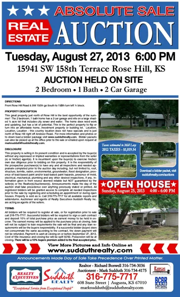 This great property just north of Rose Hill is the best opportunity of the summer! The 2 bedroom, 1 bath home has a 2 car garage and sits on a large shaded 1/2 acre lot that includes city sewer and water. The home does need work and updated, but has a lot of potential. This is the perfect property to flip or turn into an affordable home, investment property of building lot. Location, Location, Location - this country location does not have specials and is just north of Rose Hill right off Andover Road.