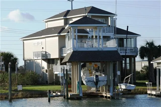 Beautiful Lafitte's Cove canal front home on almost a 1/2 acre lot. Lot is situated at the intersection of 2 canals, beautiful views of Bay and canals. Screened porches on ground and main levels of the home. Open concept living area with high ceilings and views. Wood floors on main level, carpet in upstairs Master Suite. Kitchen has granite counters, custom cabinetry, stainless appliances. Upstairs Master Suite is over 600 sq ft. Large deck and gazebo over boat house are perfect for entertaining.