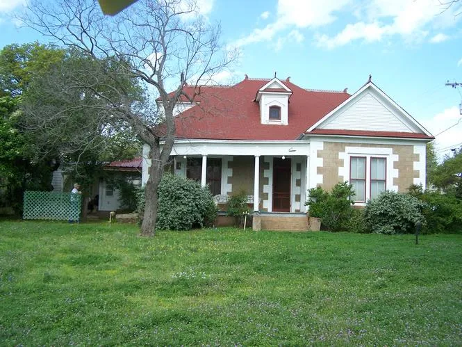 One of the premier historical homes in Mason, the Durst/Jordan home was built in 1909 and is listed in the Historic Site Survey. A Classical Revival style home, it is one and one-half story rock with stucco scored to resemble stone with a composition hip and gable roof pierced by two dormers, shamrock metal cresting with finials on ridge lines and dormers. Articulated quoins define the exterior corners of the home and an inset front porch supported by Doric columns with architrave (ornamental banding) creates an inviting entrance. Two ornamental oval glass doors serve the front entry.