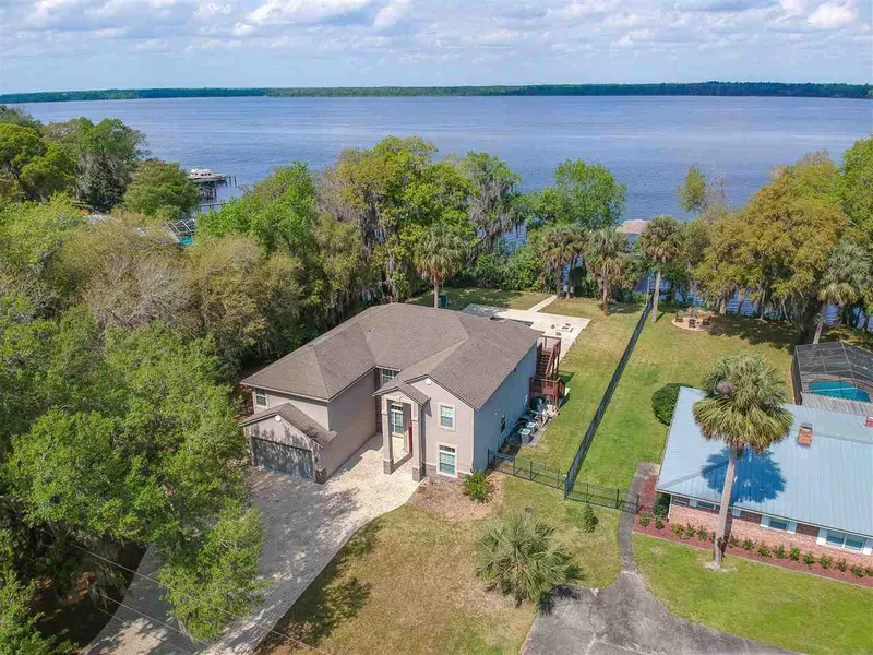 This Fabulous custom designed 4/4.5/2 home was created for a family that loves to entertain! Huge 4+ bedroom includes 2 full size master bedrooms each with luxury bathrooms, one on each level of the home. 2nd floor master with balcony spans the entire length of the home and overlooks an incredible private infinity pool/hot tub completely surrounded with a beautiful combination of tremron tumbled pavers. Just beyond the pool is direct waterfront St Johns River with private boat dock and lift. Boat dock with water/power and music pipped directly in from the house. Whether your throwing your net off the dock catching shrimp or just relaxing pool side with your tunes, this home was designed with comfort in mind. Perfectly located at the end of the street. Canal on the east and river on the north. Completely fenced back yard and surrounded by palm trees. During construction the home was built...