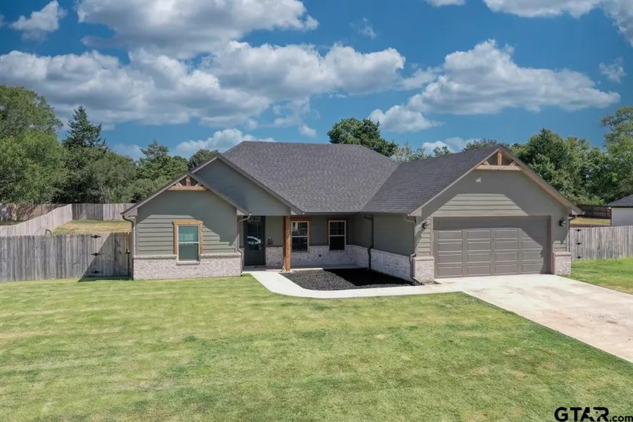 Nearly new home on half an acre in Lindale ISD! Tucked away on a quiet country street but still just minutes from the center of town. Enter the home and you are immediately greeted with the large open living, dining and kitchen area. The kitchen offers SS appliances, granite countertops and tons of cabinet space. The luxury vinyl plank floors are all throughout the home. There are two guest rooms which share a full bathroom with tub/shower combo. The owners suite is on the opposite side of the home and has a massive walk in closet, plus an en suite with double sinks, make up vanity and walk in shower. The home is finished out with a large laundry room with tons of storage and an attached 2 car garage. The back yard offers a covered patio, fully fenced yard, a small raised garden and there is a sprinkler system!