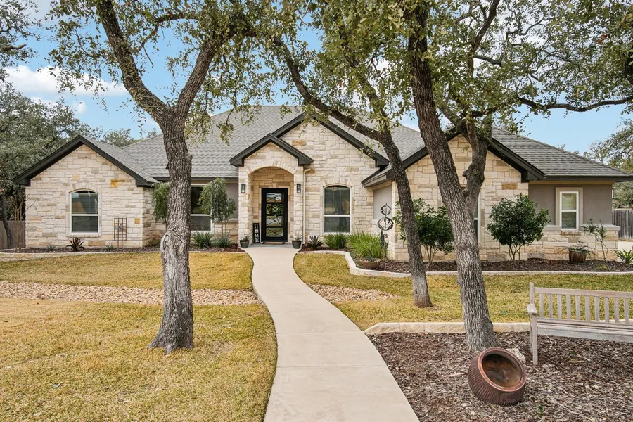 Nestled among mature oak trees, this beautifully landscaped home in Morgan's Point Resort offers elegance, space, and comfort. Boasting four sides of masonry with stone and stucco accents, this stunning residence features a three-car garage and a thoughtfully designed open floor plan. Elegant archways, high and vaulted ceilings, crown molding, and wood-look tile flooring throughout the main living spaces enhance its sophisticated appeal. The family room is a showstopper, featuring a dramatic floor-to-ceiling stone fireplace that adds warmth and character. A private office with French doors provides a quiet workspace, while the formal dining room and breakfast area offer versatile options for entertaining and everyday meals. The gourmet kitchen is a chef’s dream, featuring a large center island with ample seating, built-in appliances, and stylish finishes. The spacious primary suite is a true retreat, complete with a dual vanity, granite countertops, a relaxing garden tub, and an oversized walk-in shower. Step outside to the covered patio, perfect for outdoor gatherings, complete with a sink and counter space. The beautifully fenced backyard offers privacy and shade with its lush trees. Residents also enjoy access to a community pond, adding to the serene atmosphere. Located near the picturesque shores of Lake Belton, this home offers both tranquility and convenience.