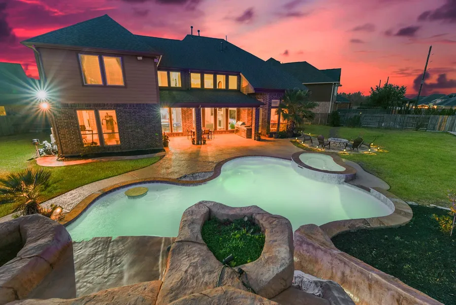 Welcome home to this stunning 2-story home located on a cul-de-sac lot, offering a spacious backyard with a heated pool and spa. Upon entering, you’re greeted by a grand foyer that leads to a private home office with French doors and an elegant formal dining room. The dining room flows seamlessly into the chef-inspired kitchen through the Butler's Pantry. The kitchen boasts a large island with seating and offers views into the expansive living room, featuring soaring ceilings. A bright breakfast room is flooded with natural light from numerous windows. The luxurious Owner's Suite is located on the main floor, along with a guest en suite bedroom. Two staircases lead to the second floor, where you'll find three guest bedrooms, each with an attached bathroom, two office nooks, a massive game room and media room. The backyard is an entertainer’s paradise with a large covered patio, pool, spa, firepit, and plenty of space for outdoor fun. Schedule your appointment today before it is gone!