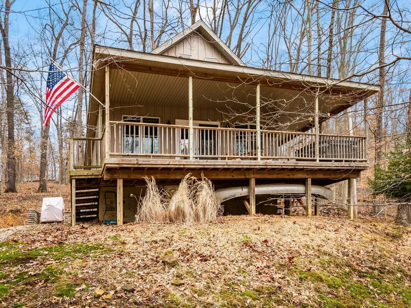 Unpack and enjoy this move-in-ready 2 bedroom home with loft in Hide-A-Way Hills. Secluded setting in woods with beautiful views from every room. Interior features include vaulted ceiling, living room with fireplace, kitchen, eating area, 2 large bedrooms, full bath, laundry, and spiral staircase which leads to loft with skylights. Outside features include huge deck, patio and hot tub.