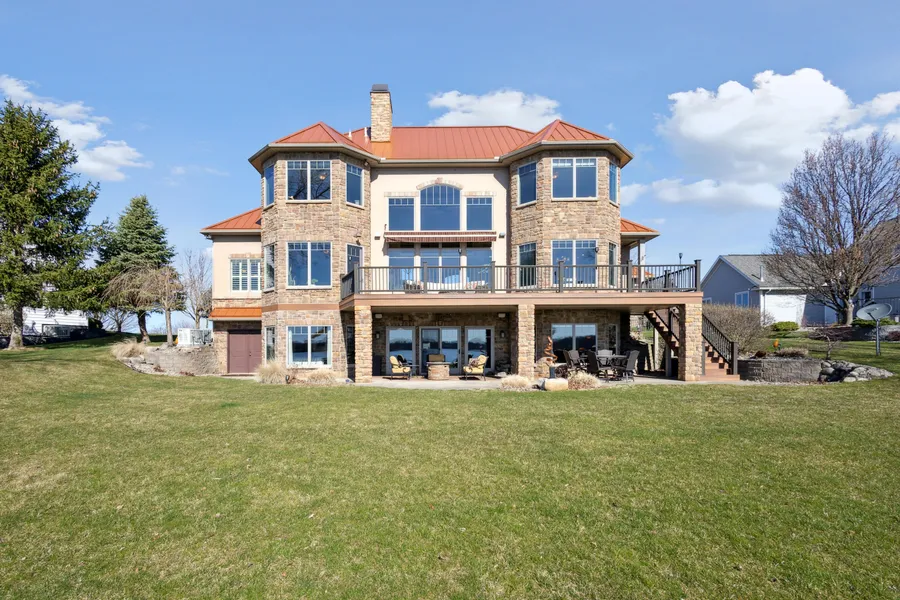 Your once in a lifetime opportunity is here! An amazing lakefront home with just under 5000 finished sq ft. 25552 Island View Lane which is a 3.22 acre fenced back lot with a pole building, potting shed and garden that has electric and water. Also, a 3/4-acre island with walking trails, small dock, firepit and so much more. This luxurious custom-built home has 4 bedrooms all with private ensuite baths. Home was well thought out and has all the bedrooms lake facing with great views. Lower level is a walkout to the water with heated floors. All levels are wired with speakers even outside. Lights, speakers, thermostat and sprinkler system controlled by Smart Home app even when away. 3 fireplaces, whole house generator, sauna and so much more. Features sheet in documents.