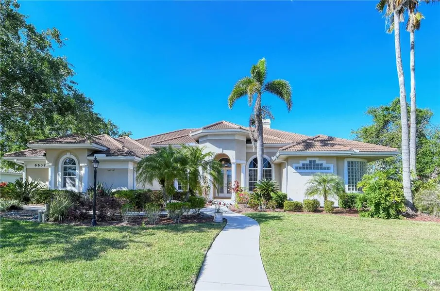 If you've been waiting for the perfect Florida home for a family or multi-generational living - it's here! Custom Peregrine build with almost 4600 square feet - one of the largest one-story homes in gated Serenoa! With tennis courts, clubhouse, social gatherings and optional golf membership - there's fun for all ages. Set on over acre, the home has no rear neighbors and beautiful preserve views with privacy. Beautifully updated with a transitional style and spa-like feel - a perfect blend of clean, modern design but comfortable. Spacious doesn't adequately describe this 5 bedroom, 4.5 bath with an office/den - that gives everyone room to roam and flexible areas for work, play and privacy. From the moment you enter, you'll be wowed by the soaring 14' triple tray ceilings, pocketing sliders with views to the pool, 24" porcelain tile, stacked stone fireplace, custom bar and striking spaces to entertain and dine. The kitchen is open and generous - perfect for large gatherings - with a large granite island and additional eat-in space overlooking the lush landscape. It's complete with stainless appliances, wine rack and walk-through pantry. You'll discover that striking updates make this family room a winner - with custom bookshelves, study bar, bench seating and space for the largest tv possible! The owner's suite is truly remarkable, with almost 600 square feet of living, double sided fireplace, room for a sitting area or work space. The bath wows with 2 walk-in custom closets, dual vanities with updated fixtures and quartz backsplash, water closet with bidet and separate soaking tub and shower. A true split plan offers privacy with 3 additional bedrooms and 2.5 baths off the kitchen. Guests and family will love the 19' x 14' guest/in-law suite (with full bathroom & closet) in the rear of the home with pool access. Over 2,000 square feet of pavered area to entertain and relax by your PebbleTec saltwater pool and spa - with full outdoor kitchen including grill, sink and fridge. And the kids will love the 950 square feet of raised play area - complete with artificial turf! The laundry area is oversized with a spacious mud room and the 3-car garage has AC, plenty of storage and a place for your golf cart. 15kw generator, hurricane protection, tankless hot water heaters, irrigation well. New AC (2021) and new tile roof (2019). Hardwood floors, transom windows, plantation shutters....the list goes on and on!Gated, low HOA fee, no CDDs and A-rated schools. Sport fields for baseball/soccer/football/lacrosse are right around the corner. Award-winning Siesta Key Beach is a 10-minute drive and I-75, restaurants, shopping & medical facilities are nearby. Serenoa Golf Course is optional to join but not required. Community has a 30-acre lake for residents to fish, kayak and canoe.