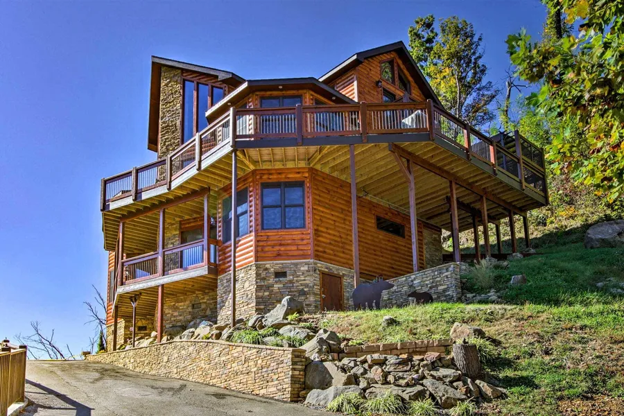 Discover mountain living at its finest with this incredible 4,200+ sq ft log cabin in Gatlinburg. This home features 5 bedrooms PLUS a set of custom bunk beds, 5.5 bathrooms, and stunning Smoky Mountain and Gatlinburg city views. Perched just minutes from downtown Gatlinburg's shops and attractions, as well as the entrance to the Great Smoky Mountains National Park, the location is unbeatable. It's practically walking distance to the Gatlinburg Aquarium in the middle of town. Take in panoramic views of the Smokies and downtown from the cabin's multiple decks and balcony levels! The main level features an open living room with fireplace, formal dining area, full kitchen, second dining space, and a luxurious primary suite. Upstairs you'll find two more bedrooms with private baths and an open loft den. The walk-out lower level has a large recreation room with fireplace, 2 bedrooms plus bunk...