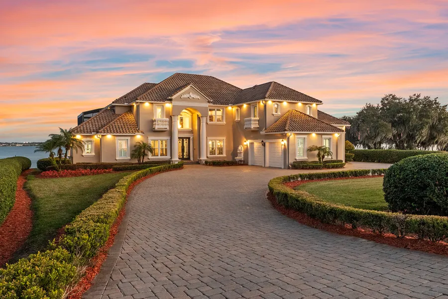 Direct lakefront custom home that is simply gorgeous. From the solid concrete construction to all the details the owners put into it, this is a one-of-a-kind, amazing offering. With over 5,300 square feet of living area, including five bedrooms, an office, a game room and a theater room, formal and family rooms, nothing is lacking here. Florida living in the sun every day from the marble-decked lanai with infinity edge heated pool, all overlooking Lake Minneola, part of the Clermont Chain of Lakes. Boathouse with boat and jet ski lifts, plus sitting area with swing and even a corkscrew slide. The circular driveway with brick pavers leads you up to the custom metal front doors and into the marble and granite-tiled foyer with a Swarovski crystal chandelier. Your eyes are immediately drawn to the views through the massive wall of windows and sliders to the shimmering waters. The family room takes full advantage of these views as well, even has room for a 98-inch TV. The gourmet kitchen has solid wood custom cabinetry, pretty granite countertops/breakfast bar and island, a paneled Sub-Zero refrigerator, built-in stainless steel appliances, even a walk-in pantry. This home was designed to take advantage of the views from almost every room. Formal dining room and living rooms, and the living area has an accent wall with display niche for collectibles. The incredible game room has a wet bar, two sets of lakeside sliders and accesses your beautiful pool, summer kitchen and sun deck, all under a custom screen with massive panels for unobstructed vistas. Full bath accessible to the lanai and pool area, two additional bedrooms and another full bath complete downstairs. Custom wrought-iron railing accents the rosewood stairs leading up to the second level. The views from the massive windows are fantastic. Sit at your built-in desk in the office and have the almost unobstructed view of the lake as your backdrop. Custom built-in shelves and cabinets, plus granite countertop complete this workspace. The master bedroom is amazing, with a double-sided fireplace between the bedroom space and sitting area, looking out over the balcony and onto the water. Dual walk-in closets with storage system, dual vanities in the bath, including a vanity desk area, a soaking jetted tub and a walk-in steam shower with multiple showerheads. The huge exercise room has its own storage closet, wet bar complete with microwave and refrigerator, wall of mirrors and even its own balcony. Two more bedrooms (one with an 11-foot-wide balcony lakeside) with plenty of closet storage and a dual bath complete this upstairs space. Side-entry two-car garage and an RV garage to fit a 46-foot RV, commercial roll door and tons of parking available on the side of the home, and the driveway is wide enough to accommodate two cars. This custom home has tons of crown molding, dentil molding, coffered ceilings, oversized baseboards and each column or baluster was poured on-site as it was built. This solid concrete home is conveniently located in Central Florida, 45 minutes to attractions and Disney, the Orlando International Airport and less than 10 minutes to shopping, restaurants and a revitalized downtown area, and the South Lake Trail. No expense was spared in this home and it shows. Even more gorgeous at night with the exterior lighting, come visit this incredible offering and stay for the magical sun across the lake. Interior and drone video attached, and appointments are available!
