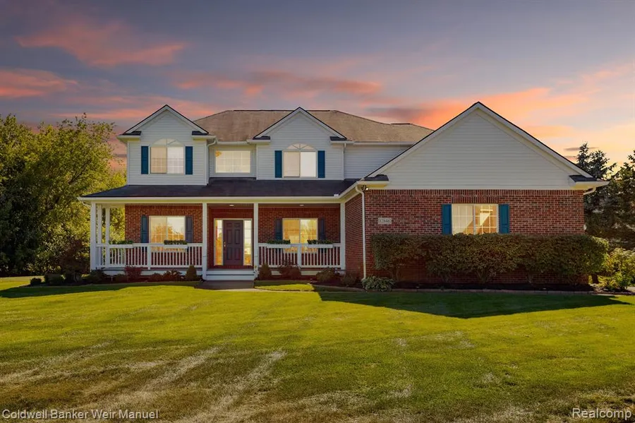 Beautiful custom built two story home that sits on a premium 1/2 acre cul-de-sac lot in a private 13 lot development. The location is wonderful! Enjoy the lower Livingston county Green Oak taxes, but with a South Lyon mailing address and the highly rated South Lyon Community School District. Just some of the features include a great floor plan with a terrific open concept, two story entry and a two story great room with large transom windows, staircase with bridge, granite island kitchen with custom soffit lighting and tile backsplash, butler's pantry with bar sink, Brazilian cherry floors, new carpet, nine foot ceilings, deep basement that is plumbed for a bath, first floor office, large master suite with a cathedral ceiling, first floor laundry room, wonderful classic covered front porch and a large low maintenance composite deck off the kitchen, plus a side patio accessed through french doors in the great room. New landscaping in 2022, newer furnace, three car side entry garage, plus many more great features to discover!