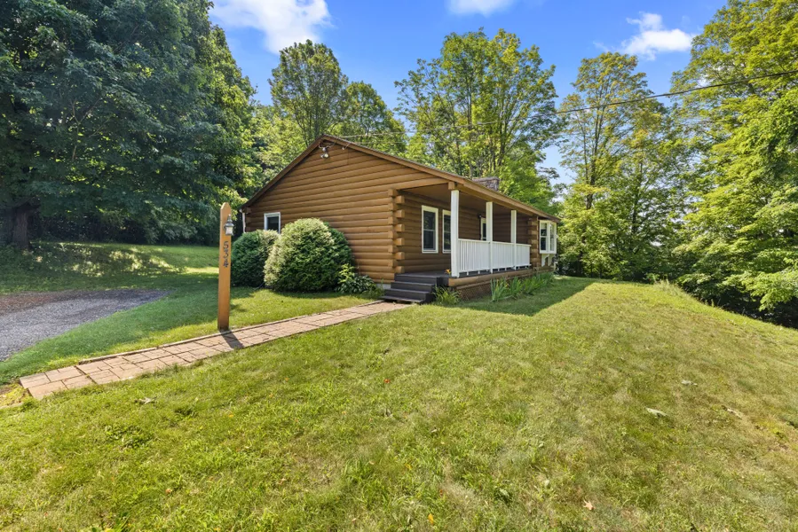 Nestled in a serene, wooded setting, this charming log cabin is a wonderful rustic retreat. With its open floor plan, beamed ceilings and stone fireplace, this home is sure to captivate your heart. The open floor plan seamlessly connects the living area, kitchen and dining space, creating an inviting ambience for both relaxation and entertainment. Two cozy bedrooms and a full bathroom complete the main level. Downstairs you will find a partially finished basement which conveniently adds space for an office, den area and bonus room. Outside in the spacious private yard you will find a wood deck, firepit and storage shed. Many major system upgrades have been made including a replaced septic system (2016), replaced well tank (2017), new propane furnace (2022), new water heater (2022) and a new whole home water softening system (2022). Move in and enjoy the warm natural beauty of this home.