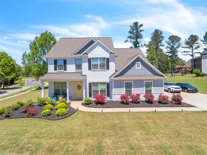 A stunning 5 bedroom 4.5 bath home located in prestigious Heron Bay Golf community is just what you are looking for! Home backs to golf course for a view of the course and woods and the homesite is level and over a half-acre with a level driveway. Maintenance will be a breeze since the homesite is practically level. This gently lived in home has features that more expensive homes offer. You will find REAL hardwood flooring as you enter which flows from the foyer to the kitchen and breakfast room. The foyer is flanked by a banquet sized dining room with a pretty trey ceiling and butlers pantry between kitchen and dining room. and office/flex room with French door entry. A very spacious family room boasts a marble surrounding fireplace and triple window view to the rear yard and course. The kitchen is open to the family room and offers an abundance of stained cabinetry, subway tile backsplash, walk in pantry, and a center work island. The countertops are Granite. You will also enjoy the designated breakfast area adjoining the kitchen. The main level boasts a generously sized guest room with a full bath. There is also a powder room on this level. The upper level is complete with 4 additional bedrooms and 3 full baths. The master suite is oversized and has a deep trey ceiling and will accommodate the largest of furnishings. Generously sized bedrooms will make living easy in this home for the whole family! Colors are neutral throughout and await your personal touches. There is a pretty covered rear porch for your outside time just enjoying the view. The laundry room is even oversized! The community offers world class amenities including a pool with a large mushroom splash pad and double waterslide into the pool. HOW FUN! Make a visit today to this home and you will love it!