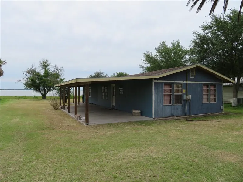 Nice large waterfront lot at lake! This is the definition of vacation! Great views over the widest part of the lake. Covered patio overlooking the lake with sliding double patio door to master bedroom. Also from the front covered patio double french doors lead to living room featuring cathedral ceiling. Split bedrooms with master in front on lake side hosting an on suite. Other 2 bedrooms in back with additional bathroom. Kitchen living and dining are open concept. Side covered patio with french door entry could be a carport. Outbuildings include a storage/workshop and a small well house. Property won't qualify for FHA, VA or conventional financing. Bank, private, or cash. Owner will not finance. This is a wonderful investment opportunity! For more information, call Dave Gaard 361.944.2794