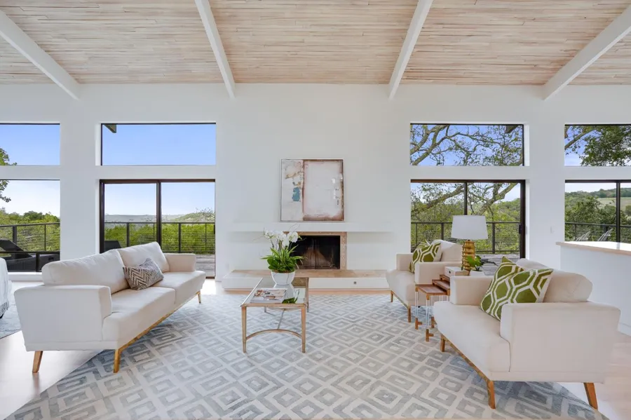 Stunning views! At the top of the hill, on one of the best cul-de-sacs in Portola Valley Ranch, you will find this gorgeous contemporary home with floor to ceiling windows and views toward the Bay. The entry level contains a primary bedroom, with a private deck, walk-in closet and an updated bathroom with a steam shower. On the same level are two additional bedrooms which share another deck, a full bathroom and laundry in the hallway. A wide hallway with 5 steps down leads you to the enormous great room with 3 sliding glass doors to the expansive deck and 180 degree view. The living room area has a wall of bookshelves and a fireplace, with ample room for a piano. A wet bar, dining area and kitchen all face the sweeping vistas. Surrounded by hundreds of acres of open space, with miles of hiking trails, this home offers a spectacular combination of livability embraced by the beauty of nature.